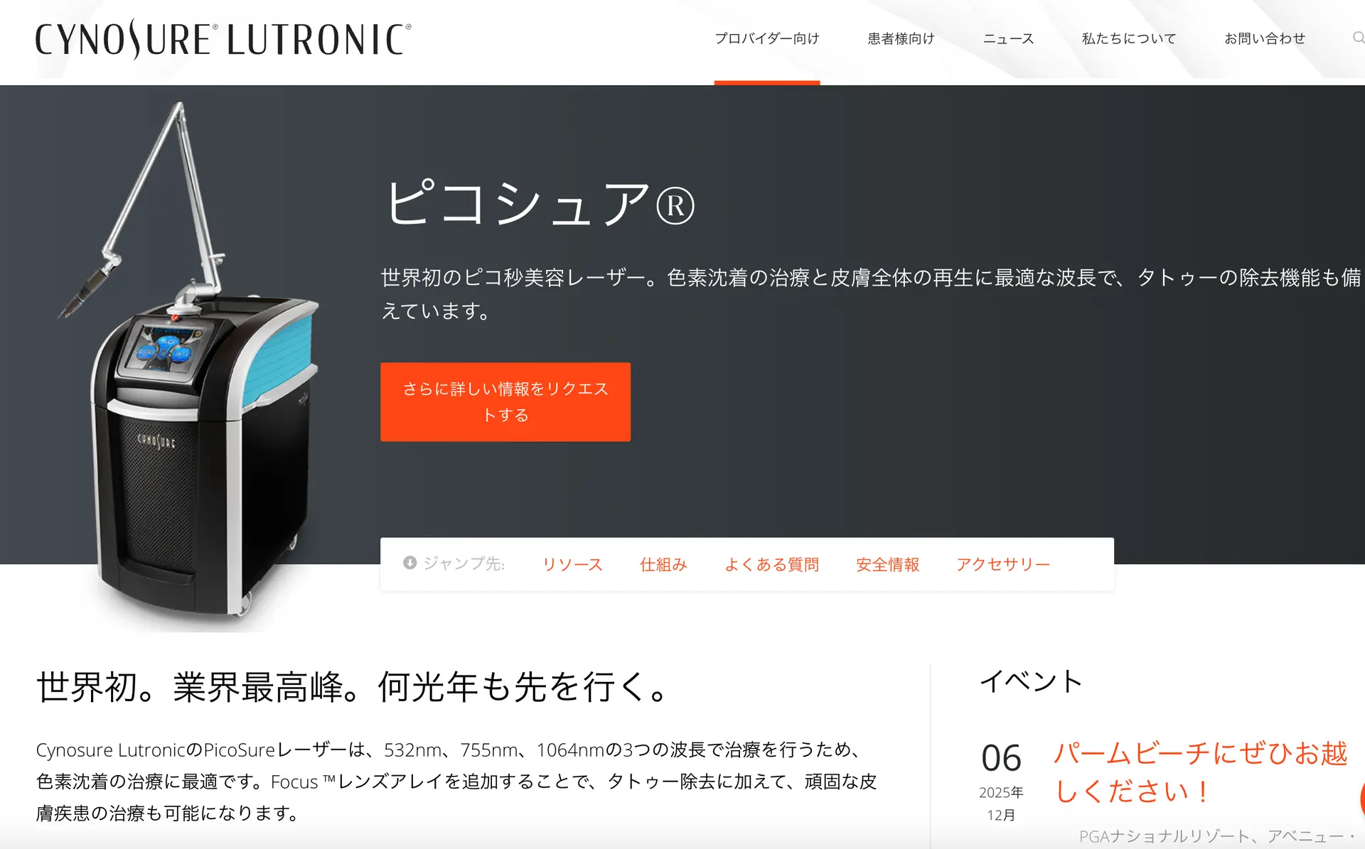 セニアクリニックでは、サイノシュア(Cynosure)社のピコシュア(PicoSure)を使用しています。ピコシュアは755nmの波長を採用し、色素に対する選択性が高いとされ、表在性の色素や残存色素の改善に幅広く利用されています。